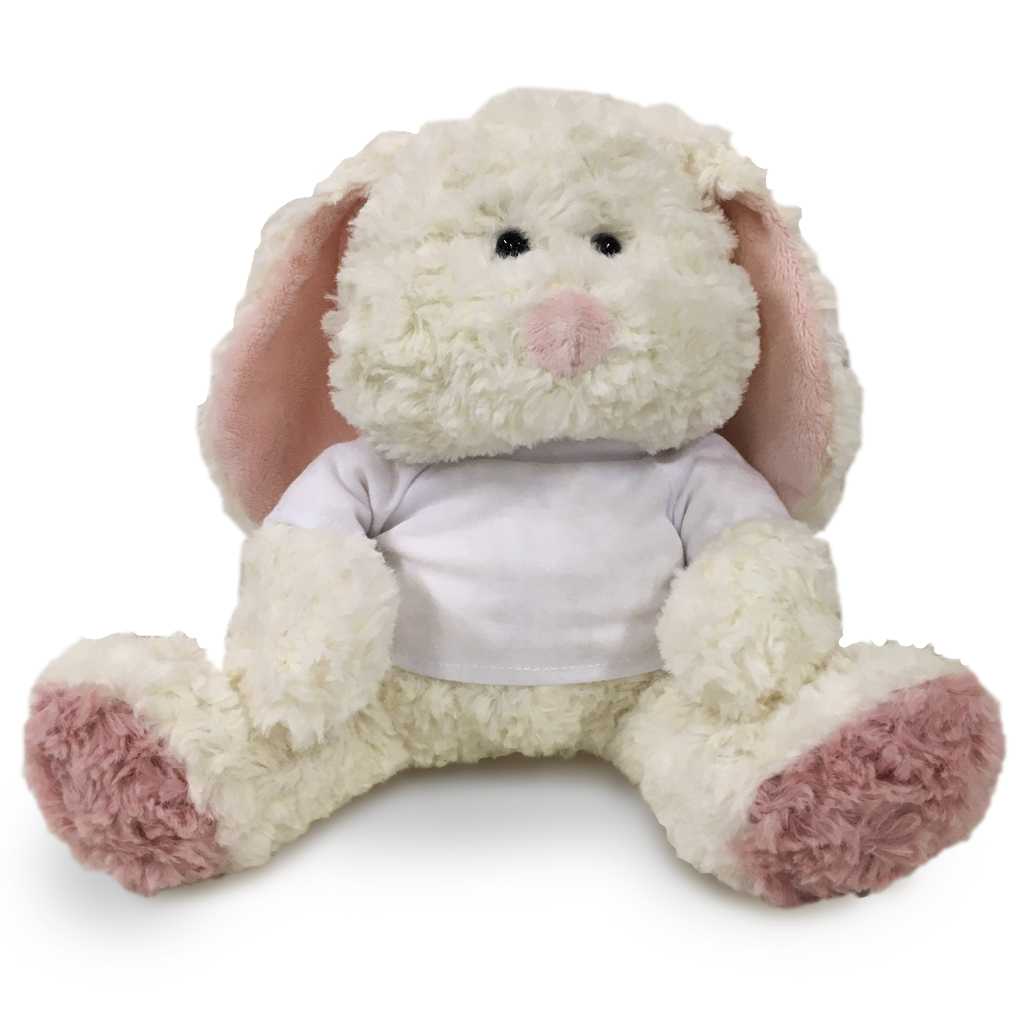 Plyšový králíček v bílém tričku určeném pro sublimační potisk. Heboučký a měkký plyš. Je možné zakoupit i bez potisku. Výška hračky vsedě je 23 cm. Vhodná jako vtipný nebo romantický dárek k Valentýnu, narozeninám či k Vánocům, pro partnera, nebo děti.